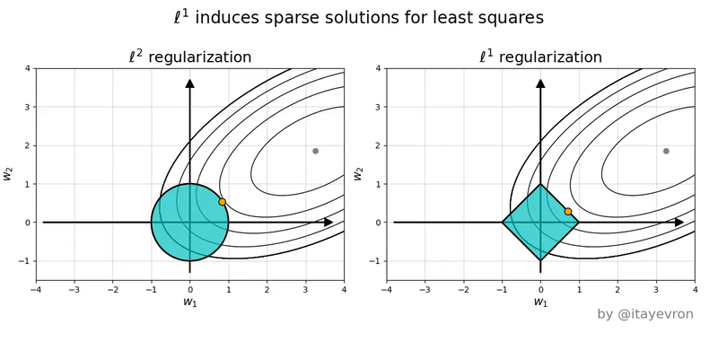 - Feature selection 효과: 꼭짓점은 $w_1, w_2$축 위에 있으므로 한 축을 선택하면 다른 축은 0으로 만들어버리는 결과