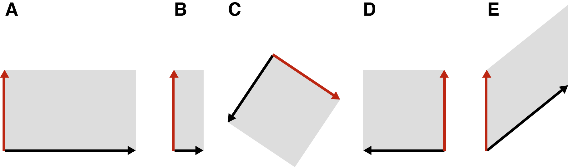 2x2 행렬은 평면의 점을 선형 변환(linear transformation)하는 연산자로 볼 수 있다. (A) 늘이기(stretching), (B) 줄이기 (compression), ((C) 회전(rotation), (D) 반사(reflection), (E) 전단(shear)으로 나타낼 수 있다.