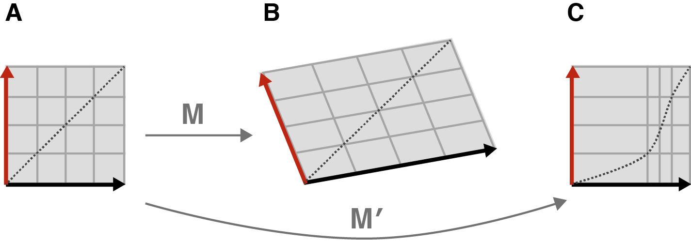 만약 선형이 아니라면, 다음 그림에서 (A)는 (C)처럼 변할 것이다. ((B)는 선형 변환)
